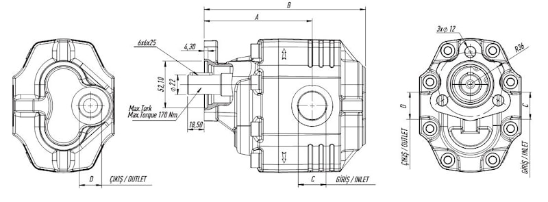 Насосы шестеренные в чугунном корпусе 3 отверстия F-UNI группа 30 300 бар, 17-127 см3 нереверсивный