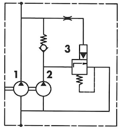 Принцип работы. При холостом ходе исполнительного механизма, пока давление в системе не выше 70 бар, происходит подача от двух секций одновременно, общий поток равен сумме подач.