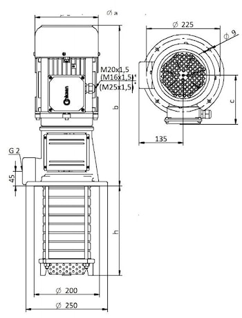 ТИП | Глубина погружения | a | b | c | Масса | Мощность | Напряжение | Частота | Ток | Скорость вращения |