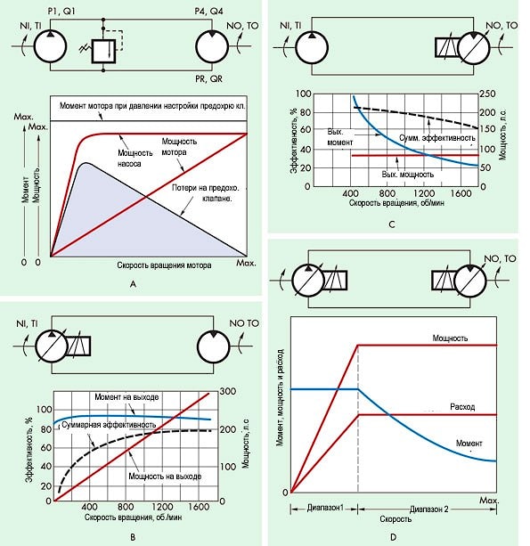На рис.3 показаны характеристики мощности / крутящего момента / скорости для насоса и мотора, при условии, что насос работает с постоянной подачей.