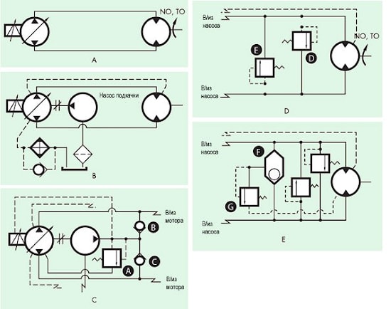 На рис. 5с показан предохранительный клапан А, который ограничивает давление насоса подкачки, которое обычно составляет 15-20 бар. Обратные клапаны В и С установленные навстречу друг к другу обеспечивают соединение всасывающей линии насоса подпитки с линией низкого давления.
