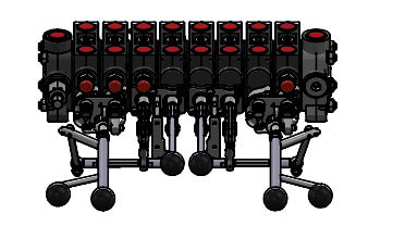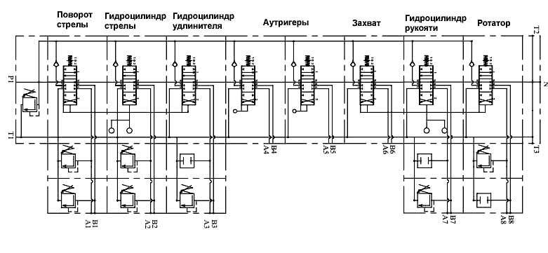 Гидрораспредель манипулятора лесовозной тележки 8 секций с двумя трехосевыми джойстиками. Предназначен для установки на лесовозные тележки с гидравлическими манипуляторами, так же на стационарные манипуляторы. В данном распределителе удобно реализована функция поворота стрелы и ротатора, что позволяет оператору с помощью одного джойстика управлять тремя золотниками (3-й золотник поворотом).