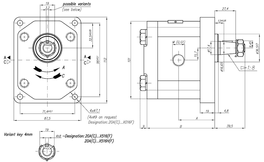 | cm3/rev | l/min | l/min | bar | rpm | mm | mm | M | G | G1 | M | G | G1 | |