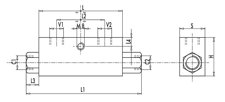 Подключение: Подключите V1 и V2 к напорным линиям, C1 и С2 к полостям цилиндра, C2 - к полости, которую надо заблокировать.