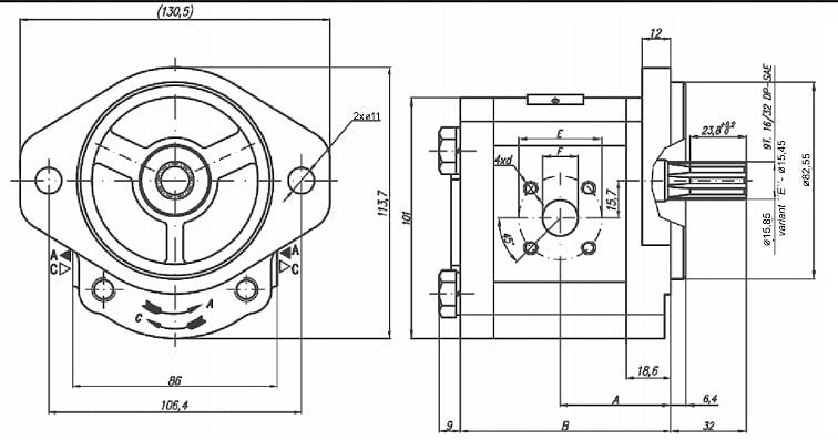 Насосы шестеренные серии X104 с фланцем SAE A, шлицевым валом. Размеры и техданные: