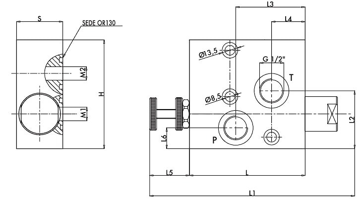 Подключение: M1, M2 - к гидромотору, Р - насос, Т - Бак (слив)
