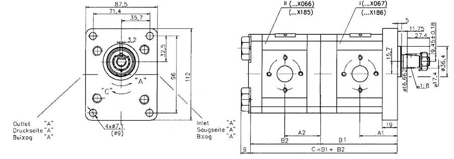 Сдвоенные шестеренные насосы 2 группа X066/X067 конический вал, европейский фланец. Размеры:
