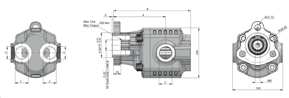 Насосы шестеренные в чугунном корпусе 3 отверстия UNI EDNA группа 20 300 бар, 6-40 см3 реверсивный