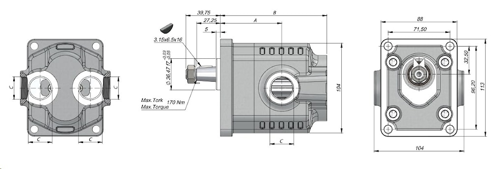 КОД | Рабочий Объем | Макс. давление длительное | Макс. давление кратк. | Макс. Пиковое Давление | Макс. Скорость Вращения Длительная | Макс. Скорость Вращения Кратковременная | Мин. Скорость Вращения | А | В | Всасывающий порт | Напорный порт |