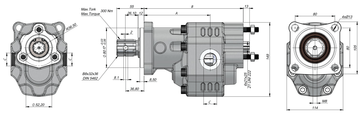 КОД | Рабочий Объем | Макс. Давление Длительное | Макс. Давление Кратковременное | Макс. Пиковое Давление | Макс. Скорость Вращения Длительная | Макс. Скорость Кратковременная Вращения | Мин. Вращения Скорость | А | В | Всасывающий Порт | Напорный Порт |