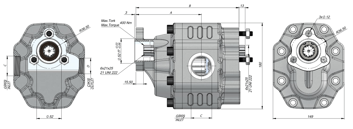 слева | (cm3/rev) | (100%)(6ар) | (20 sec. макс.) (бар) | (6 Бес.макс)(6ар) | (RPM) | (RPM) | (RPM) | (mm) | (mm) | С | D |