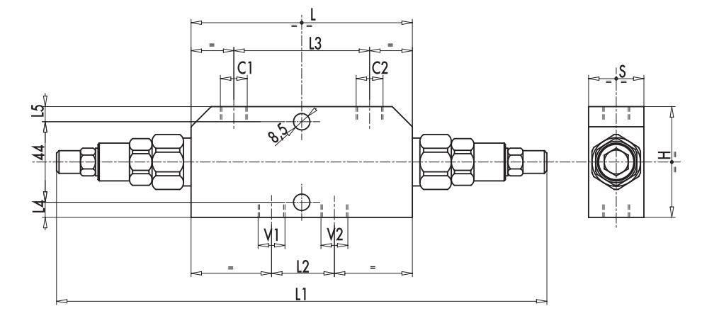 Соедините V1 и V2 c гидрораспределителем, С1 и С2 к портам гидроцилиндра.