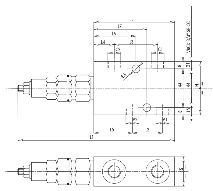 Соедините V1 и V2 c гидрораспределителем, С1 к порту свободного потока,и С2 к контролируемому порту гидроцилиндра.