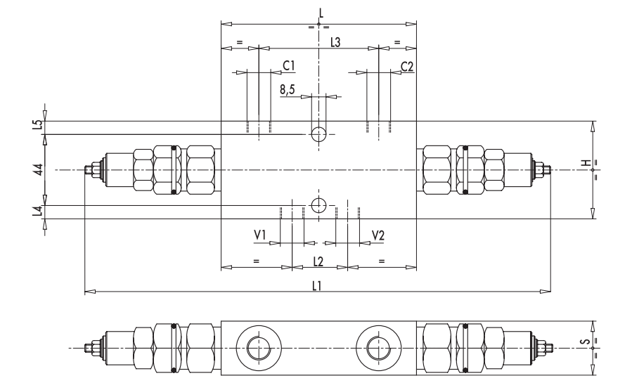 Соедините V1 и V2 c гидрораспределителем, С1 и С2 к портам гидроцилиндра.