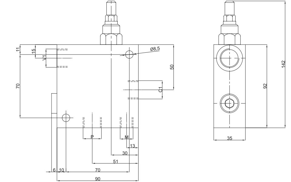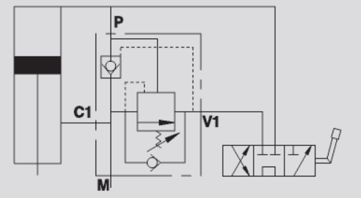 Порт С1 - штоковая полость, V1 к распределителю, P к распределителю и поршневой полости цилиндра.