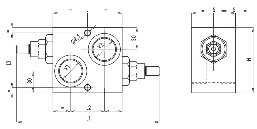Подключение: подключите V1 и V2 к потоку давления и к приводу.