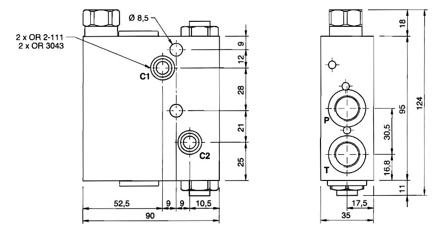 Подключение: С1 ,С2 - к гидроцилиндру, Р и Т к гидрораспределителю.
