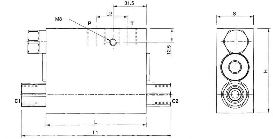 Подключение: С1 к штоковой полости ,С2 - к поршневой, Р и Т к гидрораспределителю.