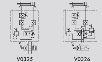 Клапаны для гидроцилиндров без памяти (V0326): разработаны для использования на гидроцилиндрах без памяти реверсивных плугов для работы вне борозды, дополнительный предохранительный клапан в линии поршневой полости ограничивает максимальное давление чтобы не повредить механические упоры и раму плуга.