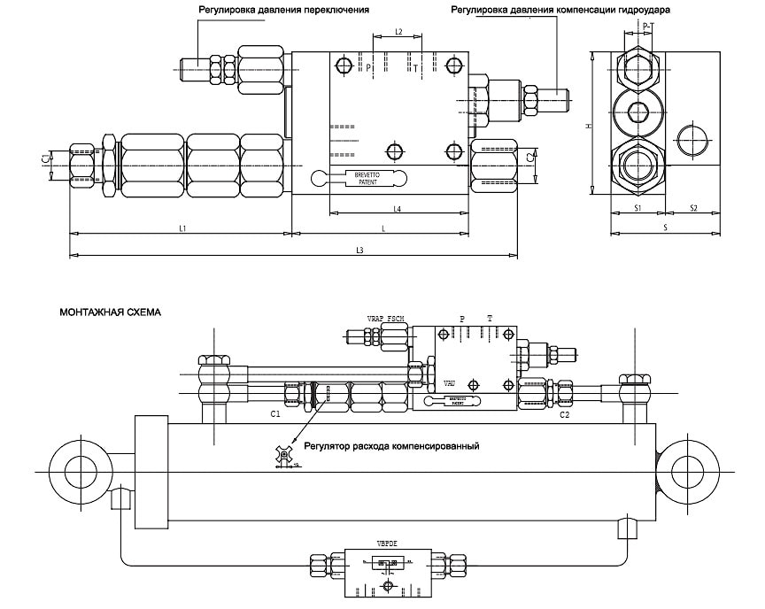 Подключение: подсоедините C1 и предохранительный клапан к стороне штока цилиндра с помощью болта банджо, поставляемого с клапаном. Подсоедините C2 к поршневой полости, P и T к питанию машины.