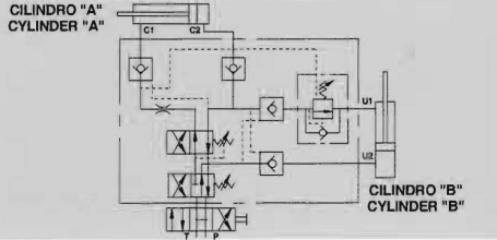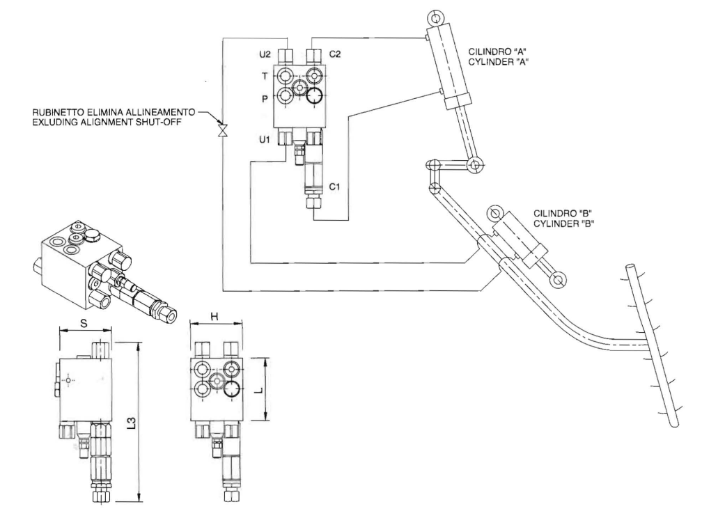 Подключение: подсоедините C1 к стороне штока, C2 к поршневой стороне опрокидывающего цилиндра A, U1 к поршневой стороне и U2 к стороне штока выравнивающего цилиндра В. P и T к распределителю машины.