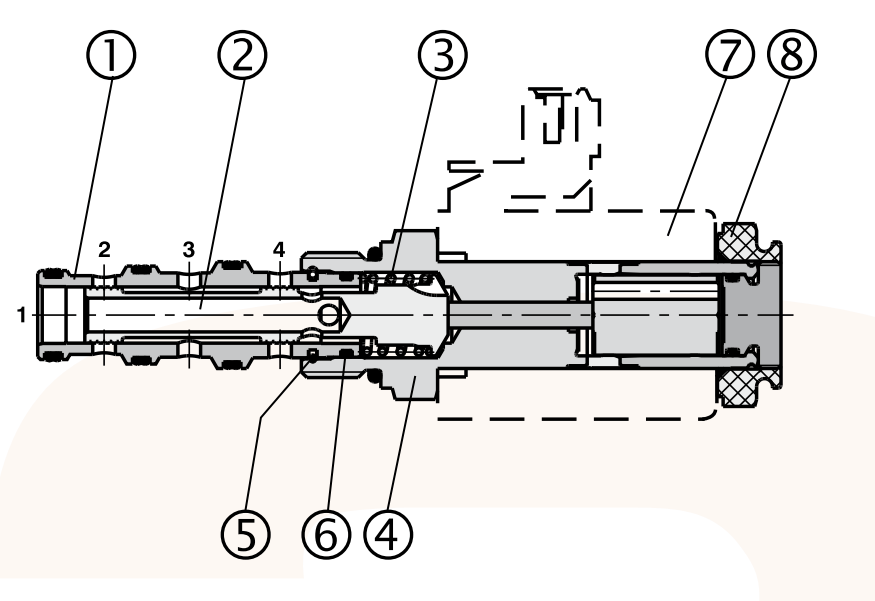 Ввертные 4/2 электромагнитные клапаны типа EV4 **. 78 состоят из втулки 1 клапана, управляющей катушки 2, возвратной пружины 3 и исполнительного узла 4, который содержит магнитные части и резьбовую секцию. Соленоид 5 закреплен на узел с помощью удерживающего гайки 6. Когда катушка находятся под напряжением, магнитный якорь сдвигается и с помощью стержня установленного внутри клапана, перемещают золотник, который соединяет между собой 1 2,3,4 порты.