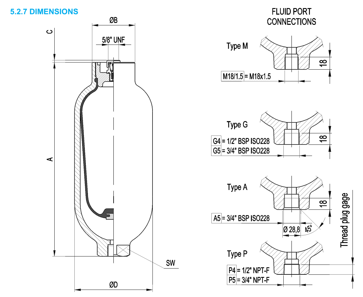 Тип | Объем ном. | Объем физ. | Ном. давление | Макс. разность давлений | Расход | Макс. степень сжатия | A | ∅B | C | ∅D | SW | Пустой вес |
