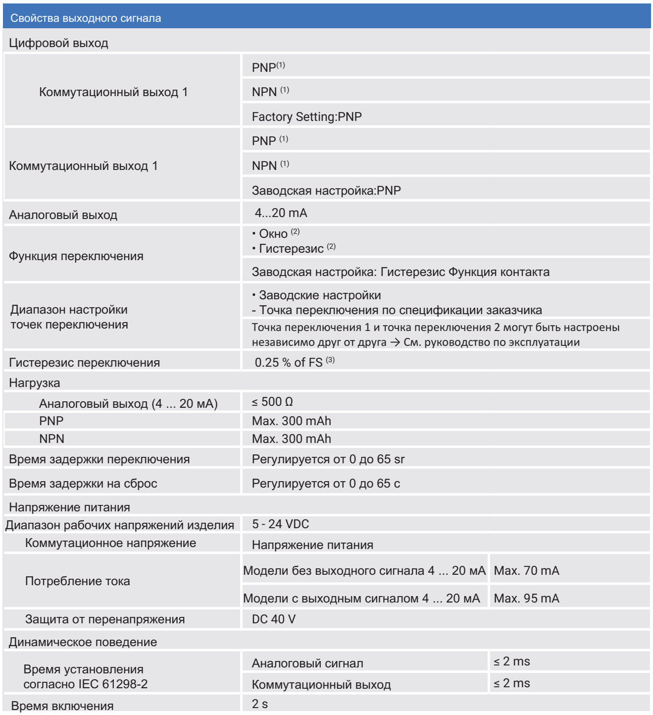 Технические характеристики диапазона измерений Вакуумная стойкость Да Устойчивость к давлению Изучите таблицу 1. (Страница:2) Цифровой дисплей Диапазон индикации 14 segment Единицы измерения bar, mbAr, psi, MPa, Цвет дисплея Голубой (LED) Размер символа 13 mm [0.51 in] Цифры 4-символа Дисплей Дисплей можно поворачивать на 180°