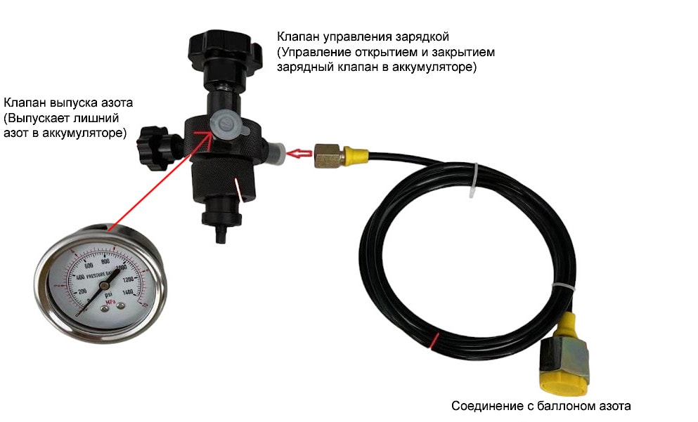 5. Откройте клапан в баллоне с азотом, чтобы зарядить аккумулятор.