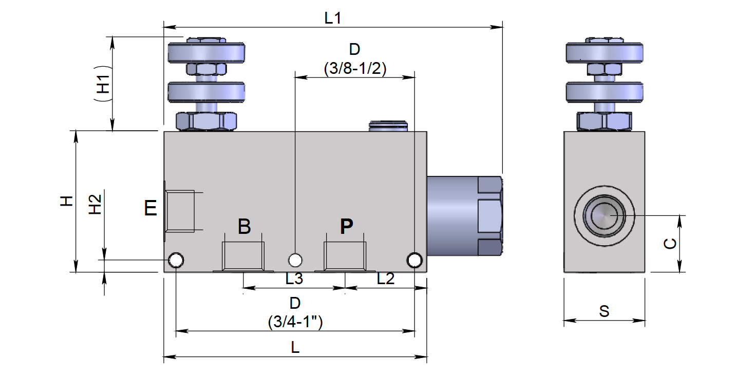 | Стандартный код | Резьба | L | L1 | L2 | L3 | C | D | H | H1 | H2 | S | Вес (кг) | Макс. поток (л/мин) | Макс. регулируемый поток(л/мин) |