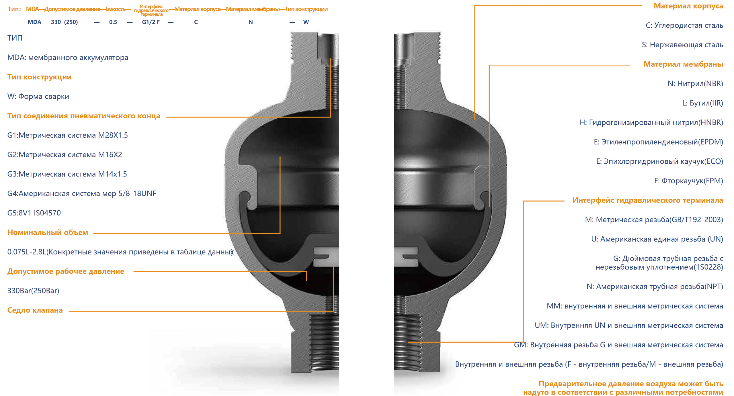 Пневмогидроаккумулятор серии MDA 0,075-3,5 литра 300 бар