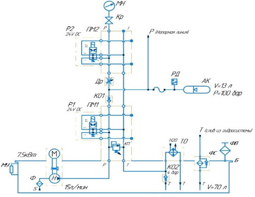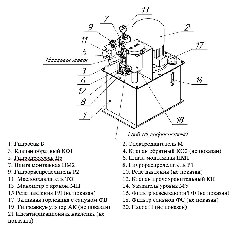 На верхней части бака смонтированы монтажные плиты (ПМ) с предохранительным клапаном (КП) и гидрораспределителями (Р). Также установлены: манометр с отсечным краном (МН), гидродроссель (Др), обратный клапан (КО1).