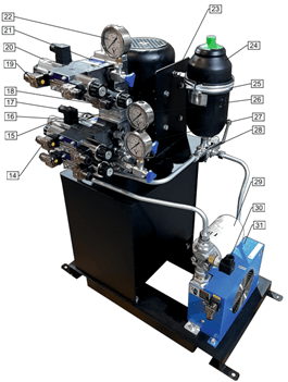 В стандартной комплектации станция включает насосный агрегат с электродвигателем, гидробак с фильтрацией, предохранительную аппаратуру, систему охлаждения и приборы контроля.