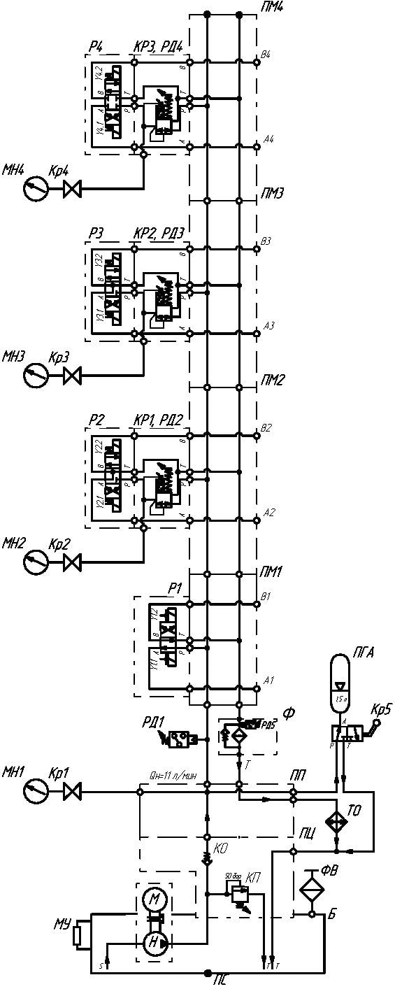 Шестеренный насос Н приводимый во вращение электродвигателем М, всасывает из бака Б гидравлическое масло и нагнетает его через обратный клапан КО под давлением в напорную линию.Далее масло попадает в плиту промежуточную ПП, плиты монтажные ПМ1-ПМ4, редукционные клапана КР1-КР3 и гидрораспределители Р1-Р4. От распределителей Р1-Р4 масло поступает к исполнительным механизмам. Распределители Р1-Р4 осуществляют управление потоком гидравлической жидкости. Редукционные клапана КР1–КР3 предназначены для снижения давления в соответствующей линии относительно общего давления в гидросистеме. Вместе с клапанами КР1-КР3 установлены реле давления РД2-РД4, которые предназначены для отключения привода гидроустановки при превышении установленного давления на редукционных клапанах КР1-КР3 согласно схемы гидравлической (см. рис. 1). В напорной линии гидросистемы установлено реле давления РД1 , которое также предназначено для отключения привода гидроустановки при превышении давления настройки. Реле давления РД5 предназначено для сигнализации рабочего персонала о загрязнении сливного фильтра Ф и необходимости замены фильтроэлемента.