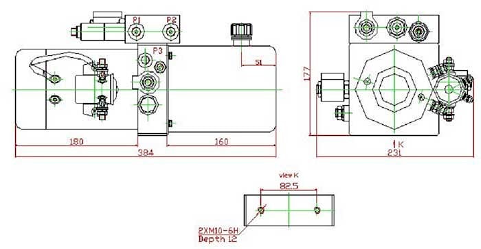 Модель | Напряжение электродвигателя | Мощность электродвигателя | Подача см3/об | Настройка предохранительного клапана | Объем бака | Напряжение управления |