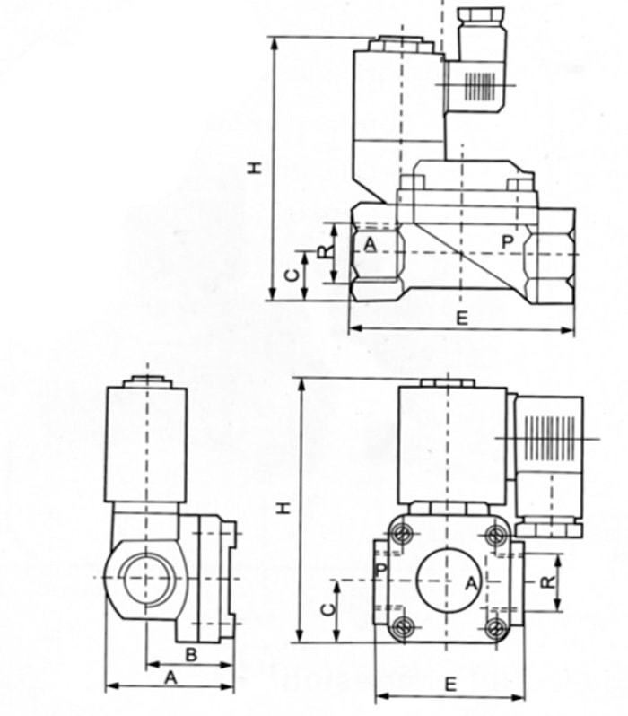 Модель | Условный проход мм | Рабочее давление МПа | Темпер. среды 0С | Температура носителя 0С | Напряж. В | A | B | C | E | H | R |