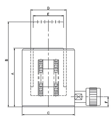 | Модель | Усилие, тонн | Ход, мм | Площадь поршня, см2 | Вместимость масла, cм3 | A | B | C | D | E | F | Масса, кг | Насос |