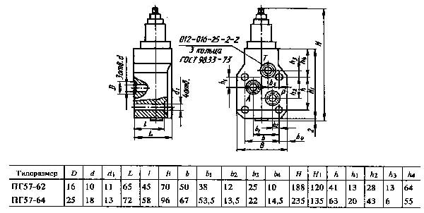 Регуляторы давления ПГ57-62 для уравновешивающих цилиндров имеют на золотнике две дросселирующие кромки, что позволяет им работать как в предохранительном, так и в редукционном режимах (в зависимости от направления потока масла в отводном отверстии).
