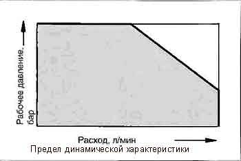 Предел динамической характеристики, который соответствует величине допустимого расхода при определенном значении давления, определяется осевой силой, возникающей в гидрораспределителе при переключении золотника.