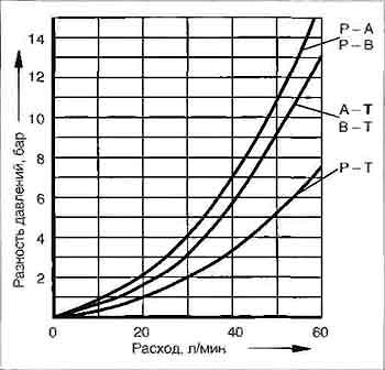 Так как перепад давлений на практике не может быть вычислен с достаточной точностью, производители определяют значения для отдельных размеров гидроаппаратов эмпирическим путем и заносят результаты в форме Ар- О характеристической кривой. При этом необходимо учитывать, соединениям каких гидролиний соответствует каждая из кривых (например, Р-А и В-T или Р-В и А-Т и т.д.).