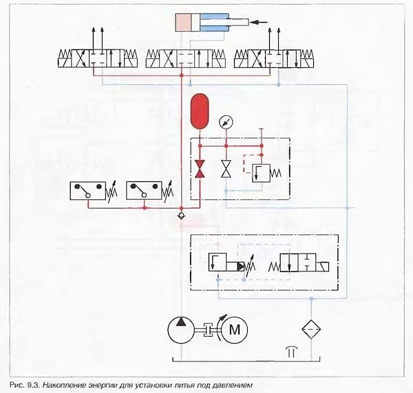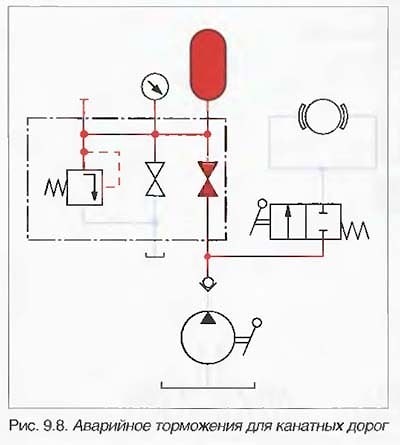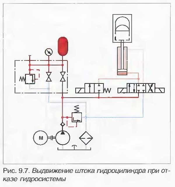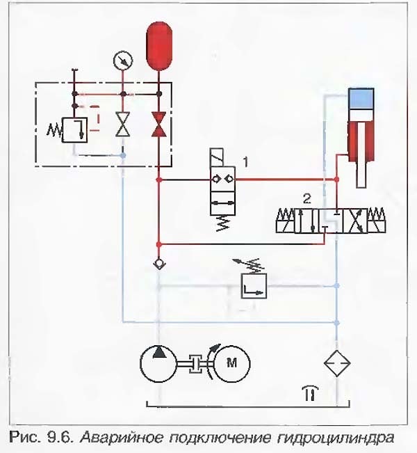 Еще один пример аварийного подключения аккумулятора, позволяющего завершить начатый рабочий цикл при отключении (сбое) насоса или отказе одного из гидрораспределителей, показан на Рис. 9.7.