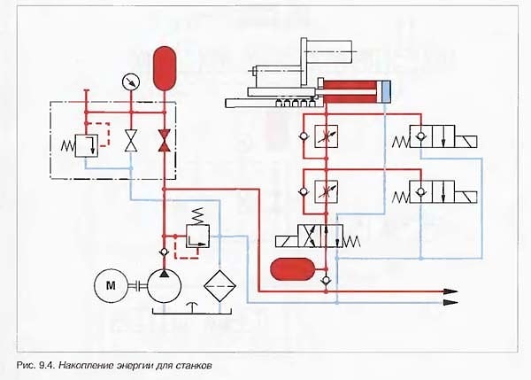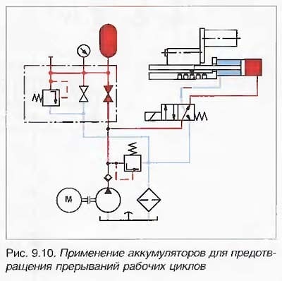За счет установки гидропневматических аккумуляторов вблизи от гидродвигателей удается легче преодолеть инерцию столба жидкости между насосом и гидродвигателем, что способствует повышению быстродействия. Кроме того, гидроаккумуляторы позволяют сгладить пульсации расхода {например, при гармонических колебаниях гидродвигателя).