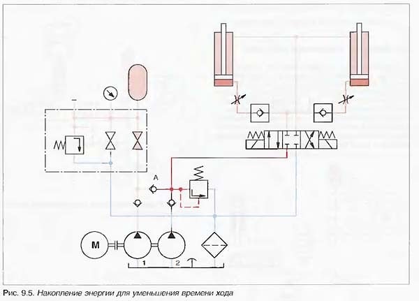 При росте давления в конце такта холостого хода обратный клапан (А) запирается, рабочая жидкость поступает в гидроцилиндр только от насоса (2) с небольшим рабочим объемом и высоким давлением, а насос (1) заряжает аккумулятор.