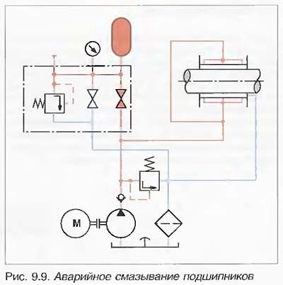 Для поддержания масляной пленки в подшипниках они должны постоянно подпитываться смазочным маслом. Это означает, что смазочные точки постоянно находятся под давлением. При отказе масляного насоса аккумулятор может поддерживать постоянное давление до тех пор, пока машина не остановится или пока установленный вспомогательный насос вновь не создаст требуемое давление в смазочной системе
