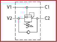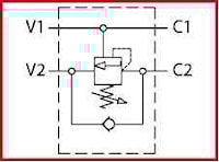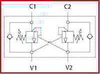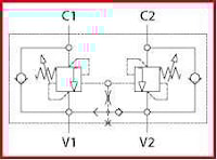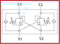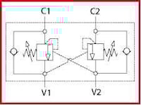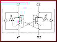 Подключение: V1, V2 напорные линии от гидрораспределителя, С1 - свободный поток к цилиндру (мотору), С2 - контролируемый поток к цилиндру (мотору)