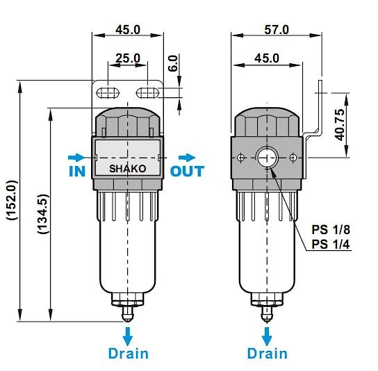 В стандартном исполнении поставляется с резьбой G1/4" , тонкостью фильтрации 5 мкм, без защиты колбы, полуавтоматическим сливом конденсата (слив происходит при падении давления в пневмомагистрали).