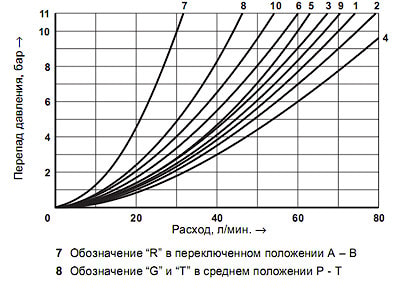 Расходные характеристики гидрораспределителей 4WE6 (измерены при v = 41 мм2/с и t = 50 °C)