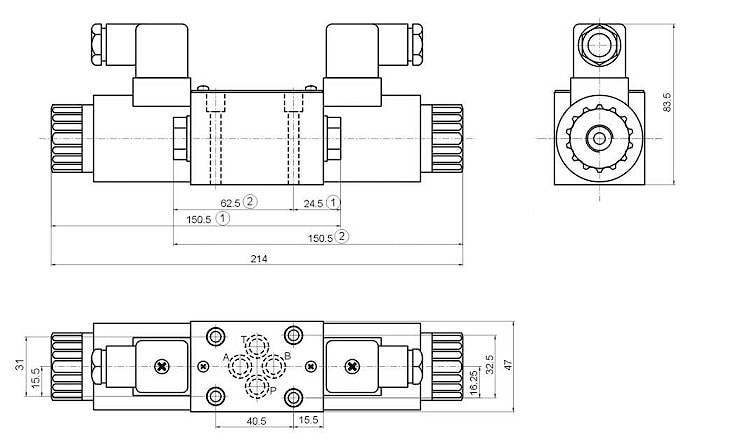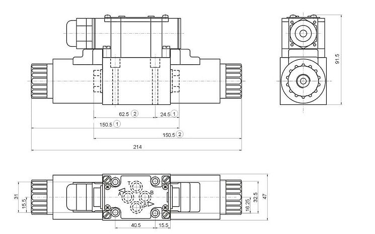 Габаритные размеры гидрораспределителей золотниковых типа 4WE6 с магнитами переменного тока, прямым подключением (клеммная коробка)