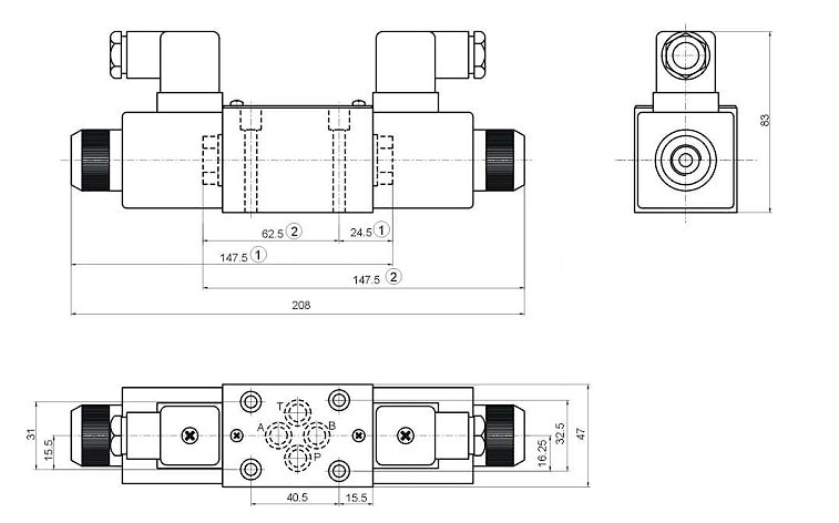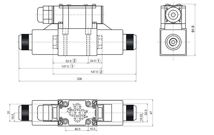 Габаритные размеры гидрораспределителей типа 4WE6 с магнитами постоянного тока, квадратными разъемами