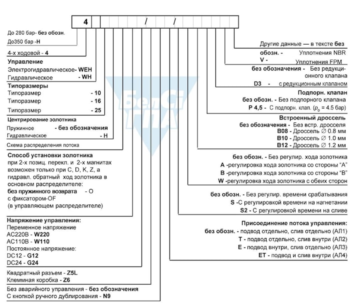 Структура условного обозначения гидрораспределителей 4WEH25, номера схем распределения потока: